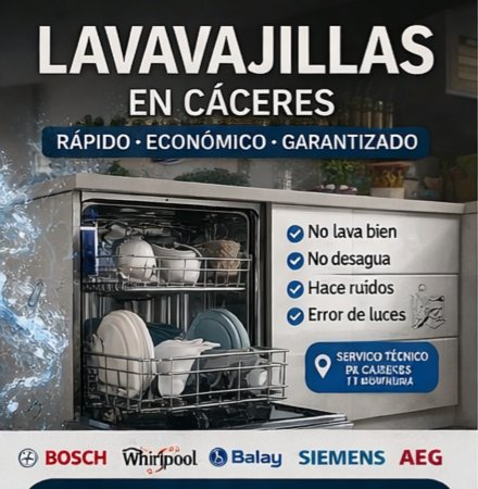 Servicio técnico de lavavajillas en Cáceres rápido y económico. Reparamos averías como lavavajillas que no desagua, no lava bien, hace ruidos o no enciende. Técnicos especializados en todas las marcas.